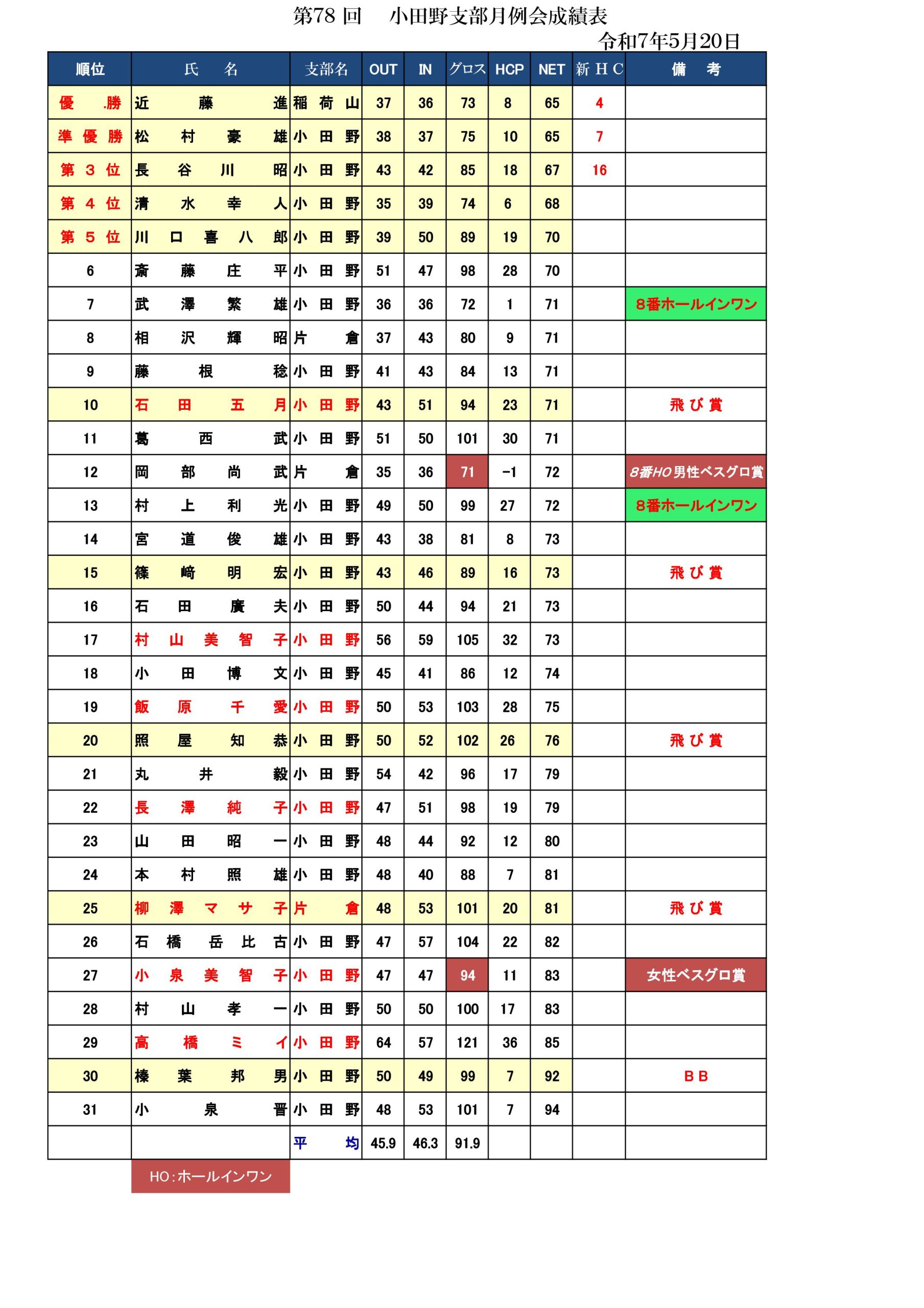 - 第85回小田野支部月例会成績表 2025-12-09