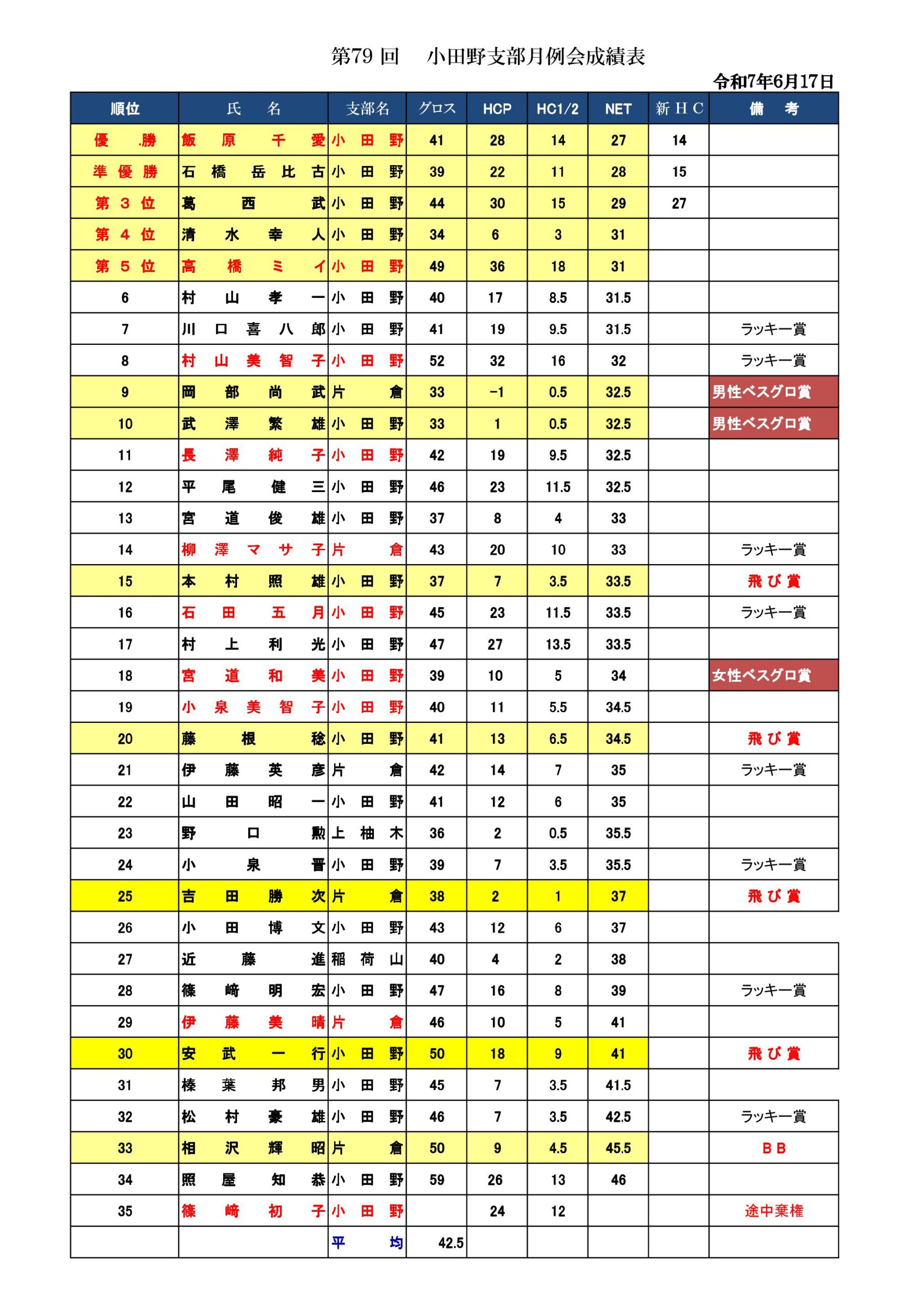 - 第78回 上柚木月例会成績表 2025-11-20