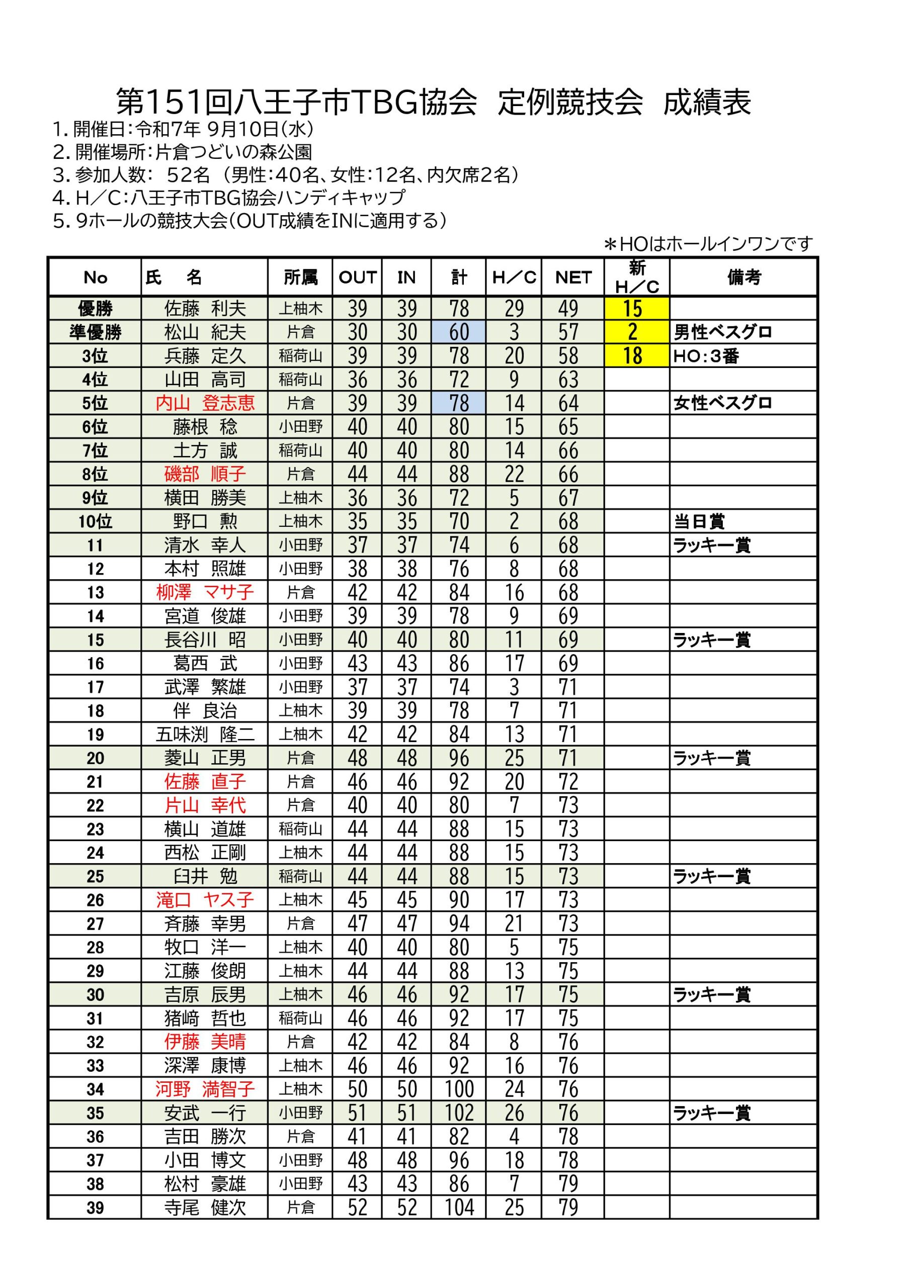 - 第78回 上柚木月例会成績表 2025-11-20