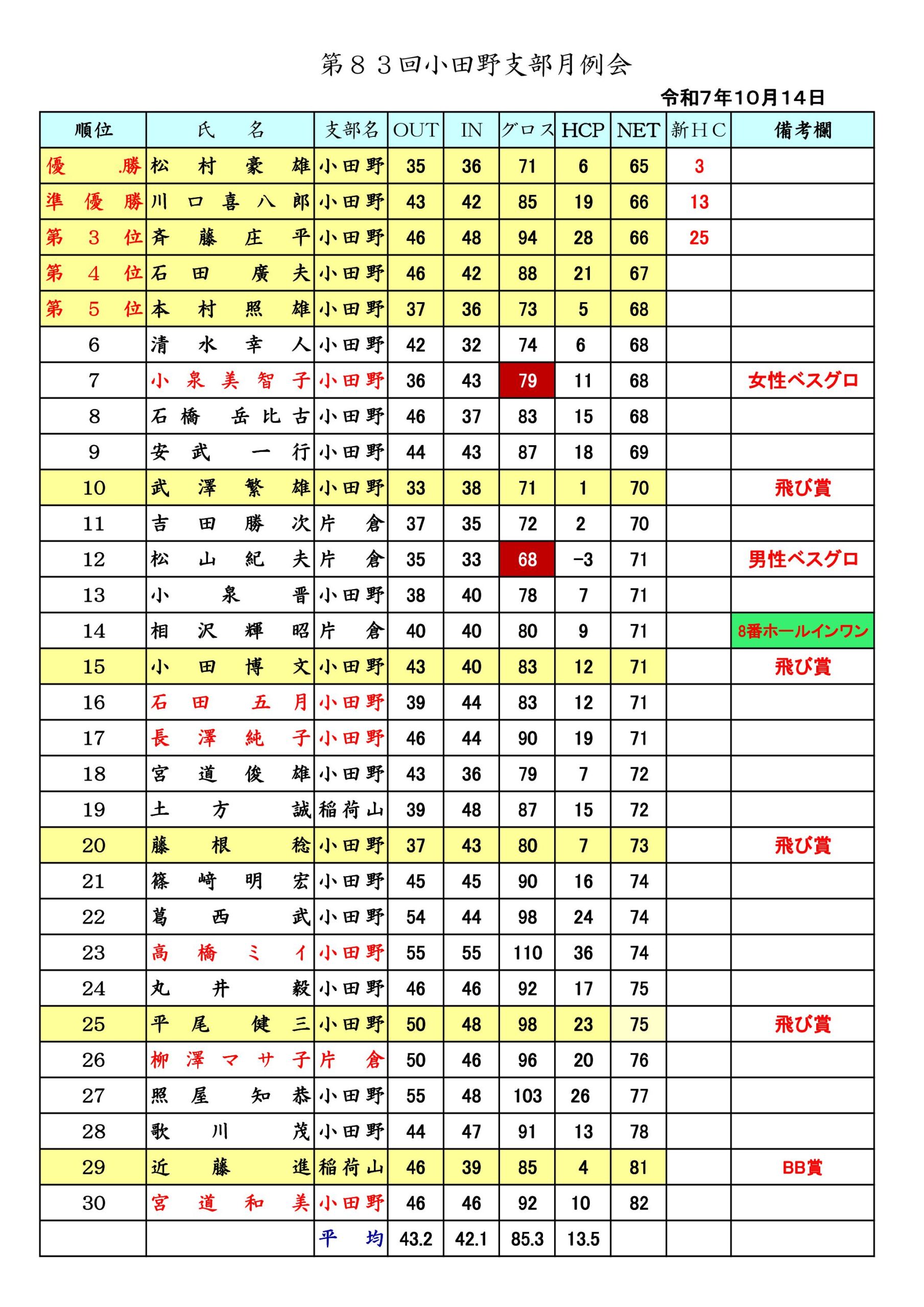 - 第84 回小田野支部月例会成績表 2025-11-11