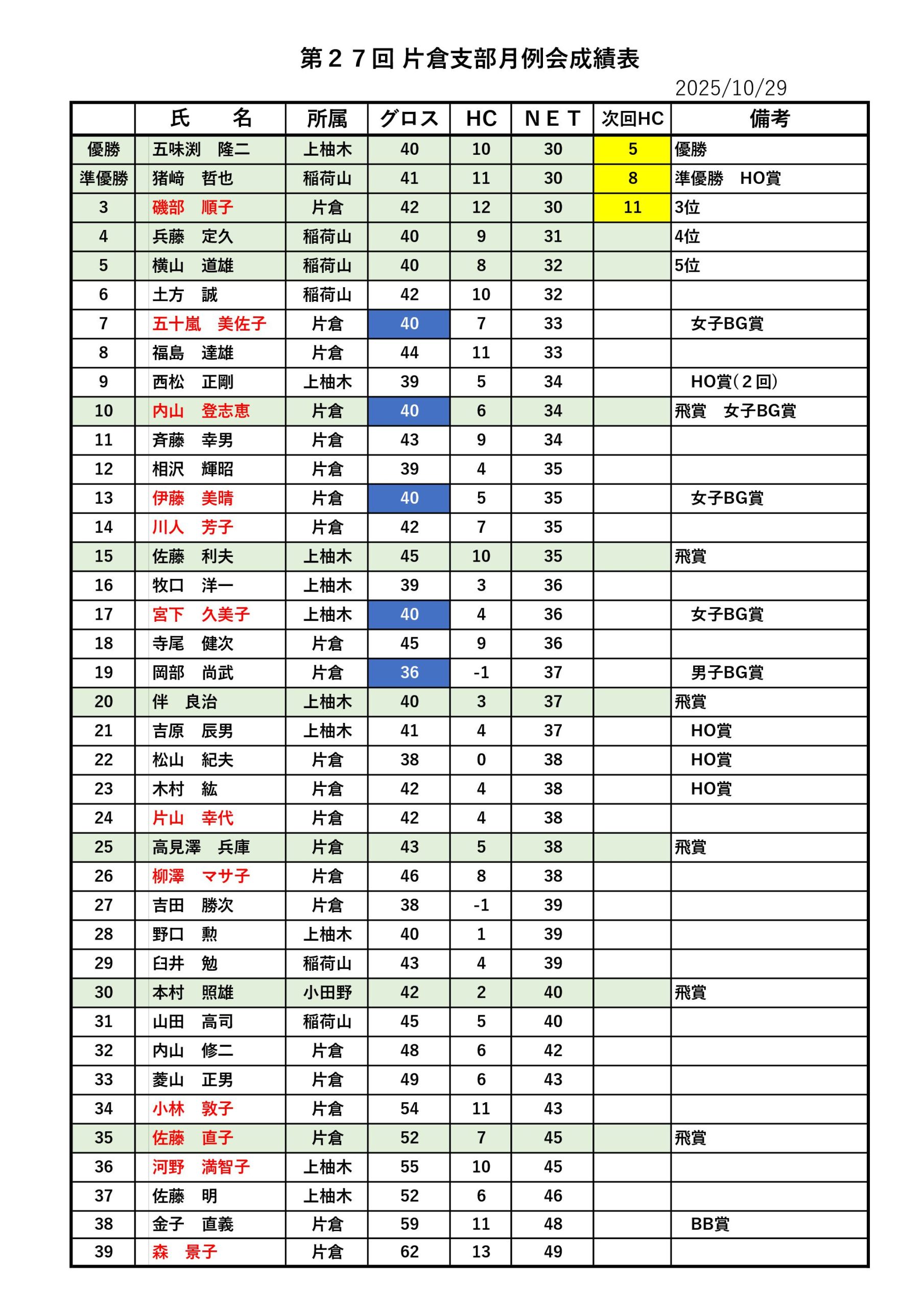 第27回 片倉支部月例会成績表 » 第27回片倉支部月例会成績表