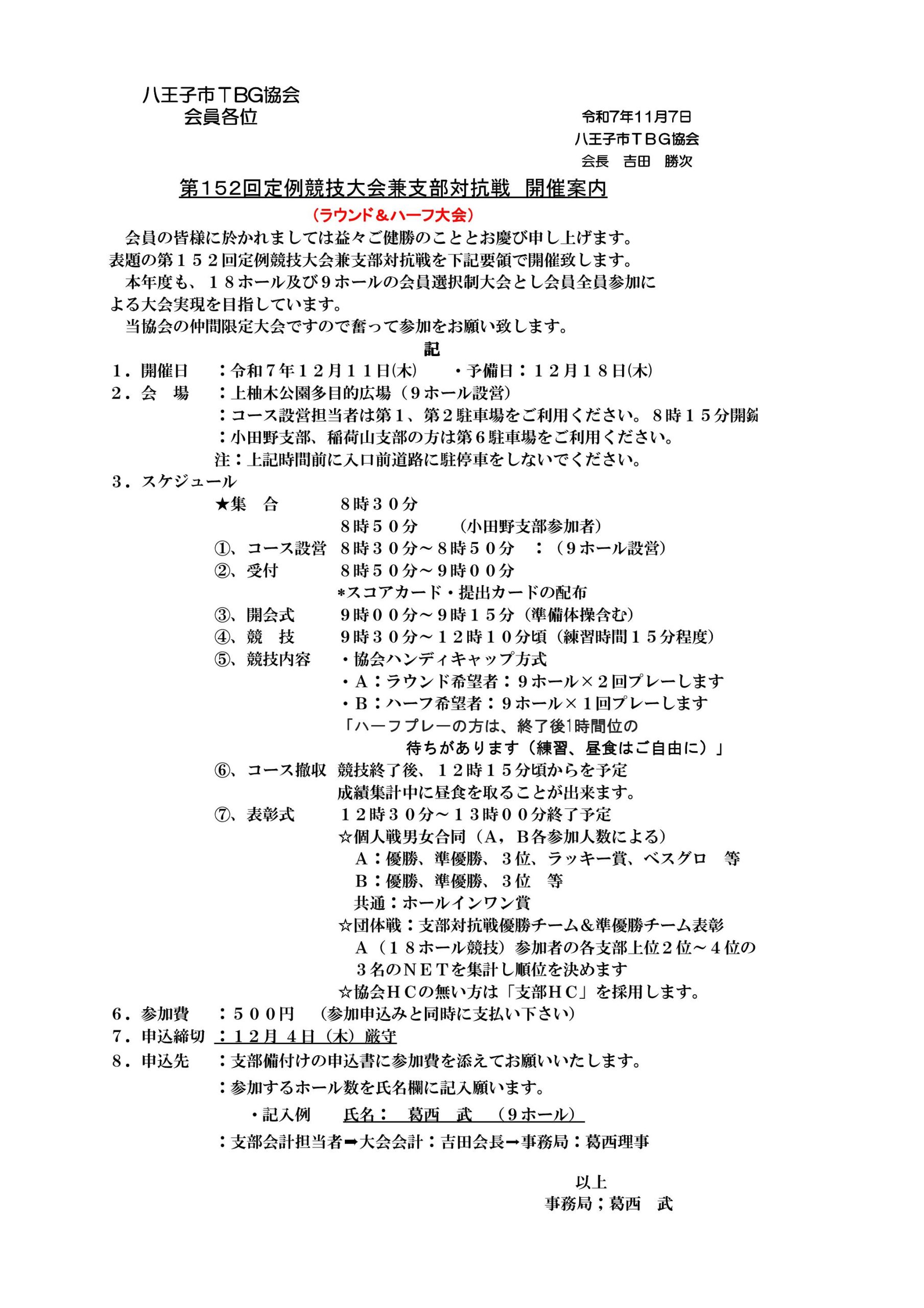 - 第152回定例競技大会兼支部対抗戦の開催案内 2025-11-07