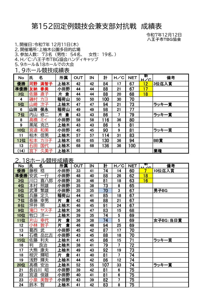 印刷用PDF 第152回八王子市定例競技会&支部対抗戦成績表