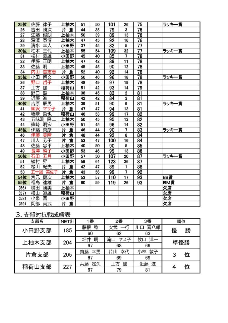 ・藤根さん優勝おめでとう。又、支部対抗戦は小田野支部優勝おめ