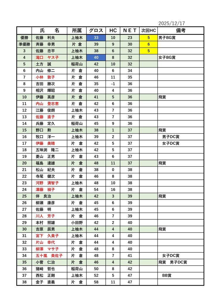 めでとうございました。とりわけベスグロ優勝の上柚木佐藤利夫さん、