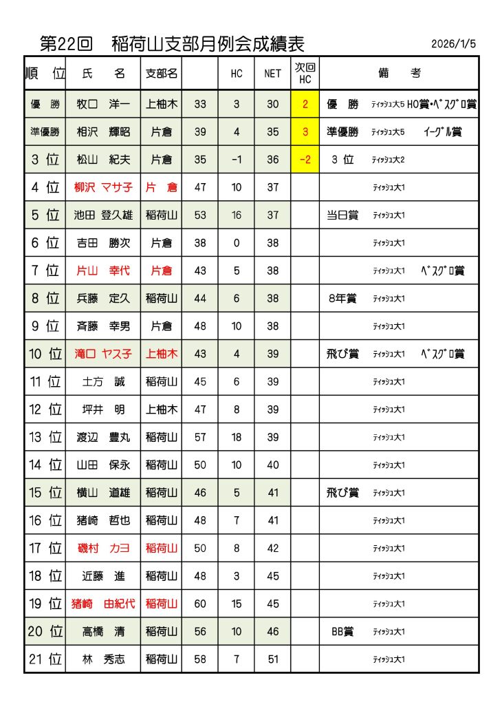 印刷用PDF 第22回稲荷山支部月例会成績表