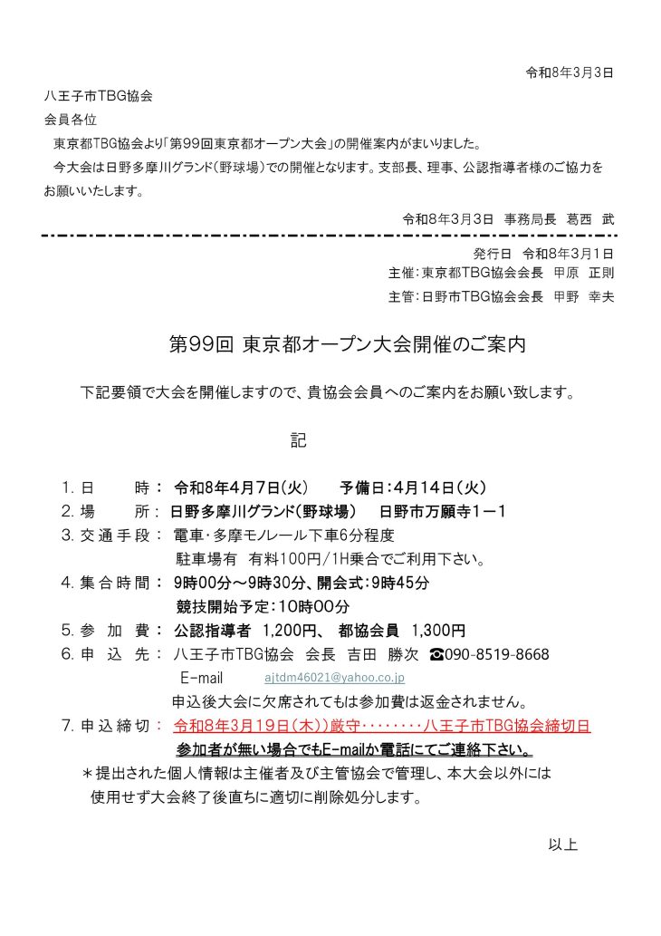 東京都TBG協会より「第99回東京都オープン大会」の開催案内